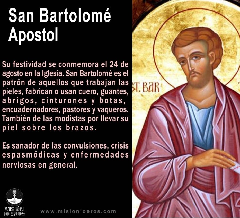 DIA DE SAN BARTOLOMÉ APÓSTOL SAN BARTOLO O NATHANAEL a year ago. San Bartolomé fue uno de los 12 apóstoles de Cristo que predicó el Evangelio después de la Ascensión del Señor.
